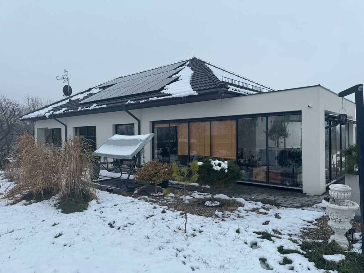Ogrzewanie domu stanowi pompa ciepła Viessmann - ogrzewanie podłogowe. Dom wyposażony jest w rekuperację mechaniczną oraz fotowoltaikę (9,67 kW).